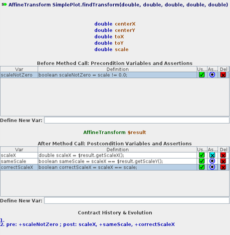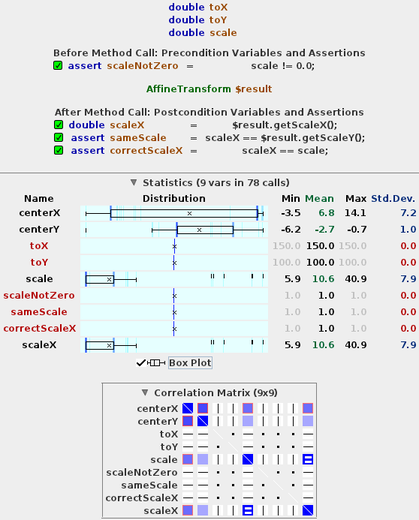 A method contract is made up of in/out arguments for the method and user-defined probe variables with Java expression definitions as seen above (added without restarting target program). All variables (in, pre, $result, post) are tracked for statistical analysis using box-plots and correlation matrix, and can also be plotted against each other using X-Y plot. To create a method contract, any boolean variable can be asserted (blue target icon) to be always true.