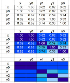 Correlation matrix: Darker boxes have higher correlation, negative correlation would be shown with red square around box. Clicking on any box brings up that X-Y plot. Nonvariables cause degenerate X-Y plots of vertical/horizontal line or single point, as highlighted in the correlation matrix view.