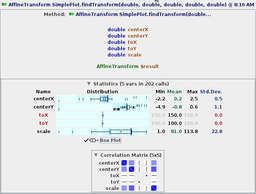Another statistics screenshot showing arguments, user-defined pre- and post-variables, box plots, range, and correlation matrix. Here, correlation matrix also has "=" icons, where two variables are always equal in value (in all method calls for this method). Boolean constant values in red (always 1.0 = True) are as we had expected. Negative correlations are shown with red box outline.